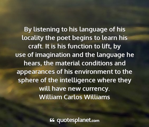 By listening to his language of his locality the poet begins to learn his craft. It is his function to lift, by use of imagination and the language he hears, the material conditions and appearances of his environment to the sphere of the intelligence where they will have new currency.William Carlos Williams