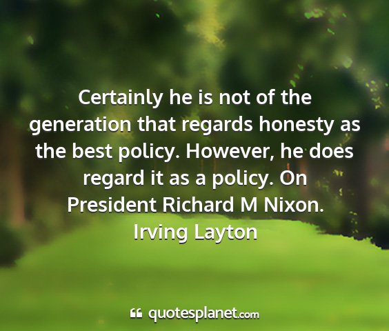 Certainly he is not of the generation that regards honesty as the best policy. However, he does regard it as a policy. On President Richard M Nixon.Irving Layton