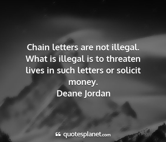 Chain letters are not illegal. What is illegal is to threaten lives in such letters or solicit money.Deane Jordan