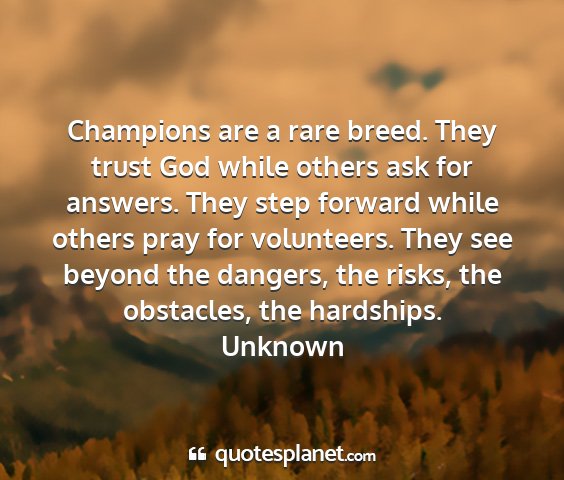 Champions are a rare breed. They trust God while others ask for answers. They step forward while others pray for volunteers. They see beyond the dangers, the risks, the obstacles, the hardships.Unknown