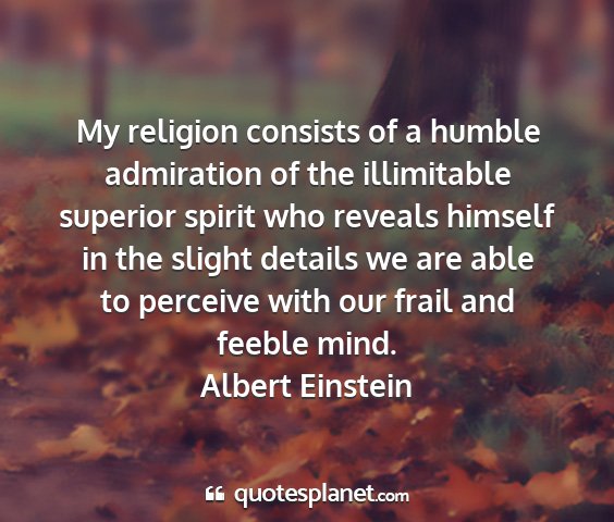 My religion consists of a humble admiration of the illimitable superior spirit who reveals himself in the slight details we are able to perceive with our frail and feeble mind.