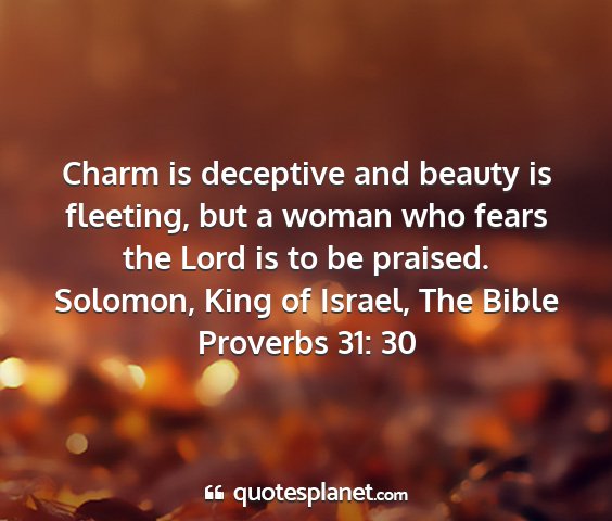 Charm is deceptive and beauty is fleeting, but a woman who fears the Lord is to be praised.Solomon, King of Israel, The Bible Proverbs 31: 30