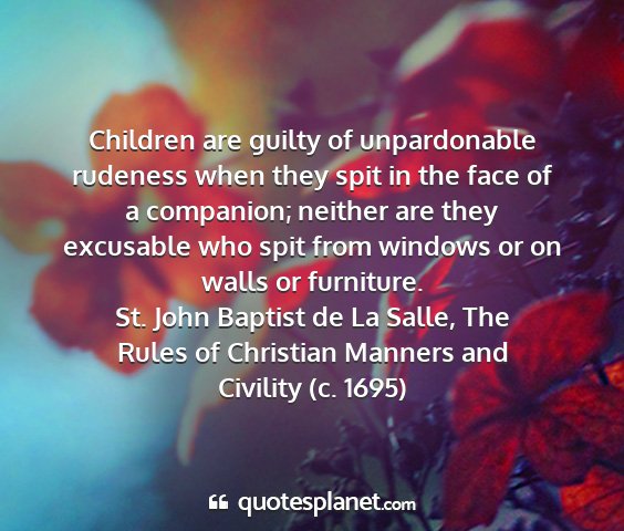 Children are guilty of unpardonable rudeness when they spit in the face of a companion; neither are they excusable who spit from windows or on walls or furniture.St. John Baptist de La Salle, The Rules of Christian Manners and Civility (c. 1695)