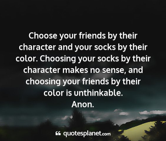 Choose your friends by their character and your socks by their color. Choosing your socks by their character makes no sense, and choosing your friends by their color is unthinkable.Anon.