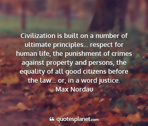 Civilization is built on a number of ultimate principles... respect for human life, the punishment of crimes against property and persons, the equality of all good citizens before the law... or, in a word justice.Max Nordau