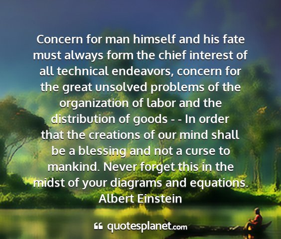Concern for man himself and his fate must always form the chief interest of all technical endeavors, concern for the great unsolved problems of the organization of labor and the distribution of goods - - In order that the creations of our mind shall be a blessing and not a curse to mankind. Never forget this in the midst of your diagrams and equations.Albert Einstein