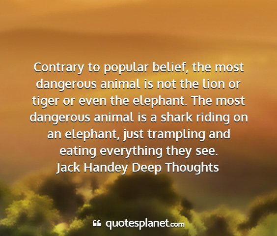 Contrary to popular belief, the most dangerous animal is not the lion or tiger or even the elephant. The most dangerous animal is a shark riding on an elephant, just trampling and eating everything they see.Jack Handey Deep Thoughts