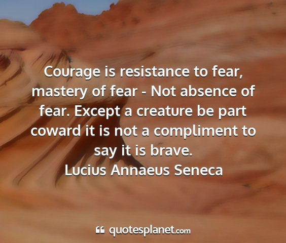 Courage is resistance to fear, mastery of fear - Not absence of fear. Except a creature be part coward it is not a compliment to say it is brave.Lucius Annaeus Seneca