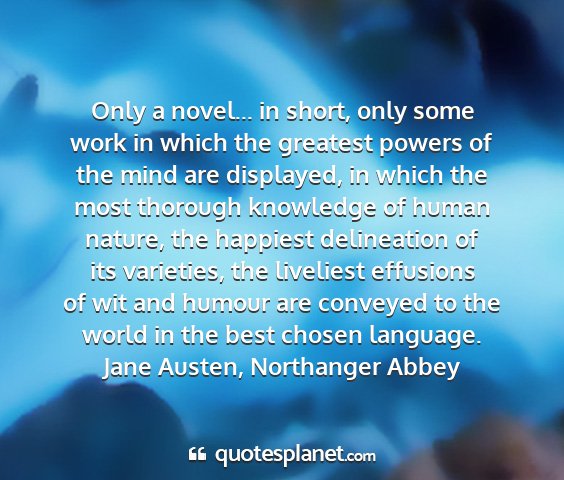Only a novel... in short, only some work in which the greatest powers of the mind are displayed, in which the most thorough knowledge of human nature, the happiest delineation of its varieties, the liveliest effusions of wit and humour are conveyed to the world in the best chosen language.Jane Austen, Northanger Abbey