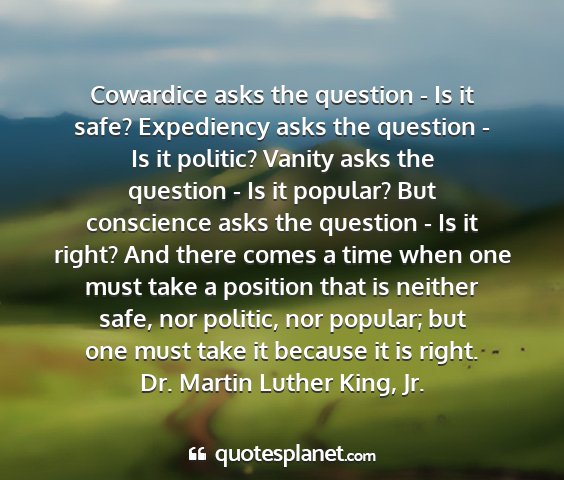 Cowardice asks the question - Is it safe? Expediency asks the question - Is it politic? Vanity asks the question - Is it popular? But conscience asks the question - Is it right? And there comes a time when one must take a position that is neither safe, nor politic, nor popular; but one must take it because it is right.Dr. Martin Luther King, Jr.