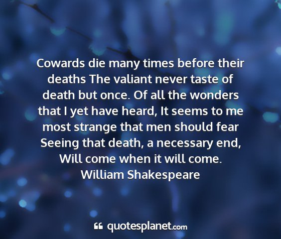 Cowards die many times before their deaths The valiant never taste of death but once. Of all the wonders that I yet have heard, It seems to me most strange that men should fear Seeing that death, a necessary end, Will come when it will come.William Shakespeare
