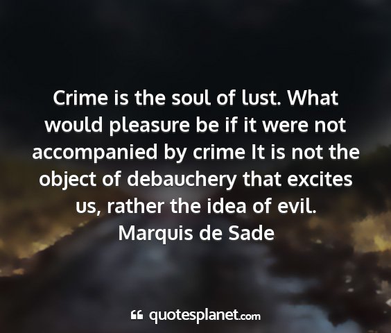 Crime is the soul of lust. What would pleasure be if it were not accompanied by crime It is not the object of debauchery that excites us, rather the idea of evil.Marquis de Sade