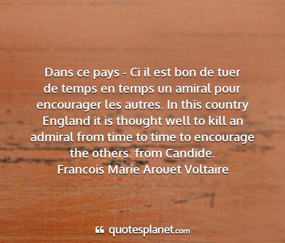 Dans ce pays - Ci il est bon de tuer de temps en temps un amiral pour encourager les autres. In this country England it is thought well to kill an admiral from time to time to encourage the others. from Candide.Francois Marie Arouet Voltaire