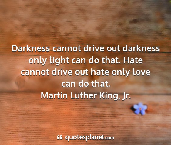 Darkness cannot drive out darkness only light can do that. Hate cannot drive out hate only love can do that.Martin Luther King, Jr.