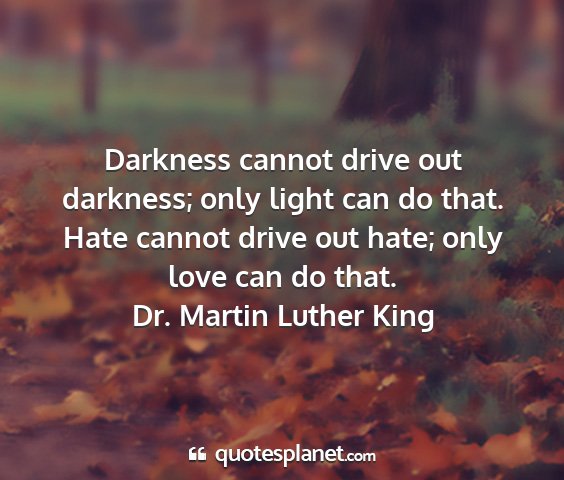 Darkness cannot drive out darkness; only light can do that. Hate cannot drive out hate; only love can do that.Dr. Martin Luther King