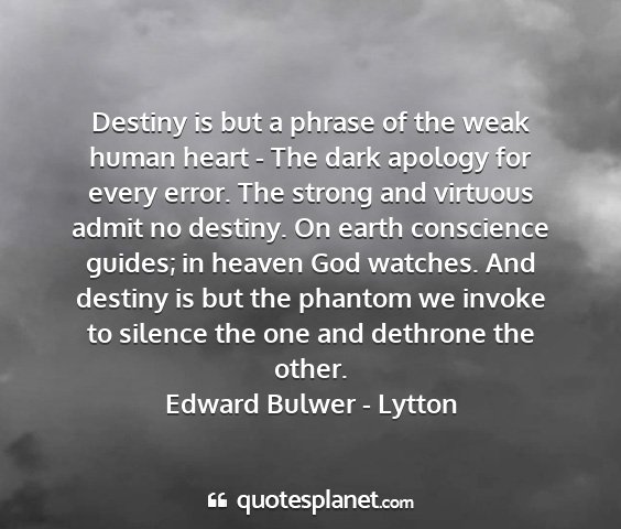 Destiny is but a phrase of the weak human heart - The dark apology for every error. The strong and virtuous admit no destiny. On earth conscience guides; in heaven God watches. And destiny is but the phantom we invoke to silence the one and dethrone the other.Edward Bulwer - Lytton