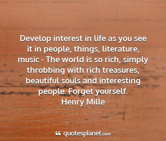 Develop interest in life as you see it in people, things, literature, music - The world is so rich, simply throbbing with rich treasures, beautiful souls and interesting people. Forget yourself.Henry Mille
