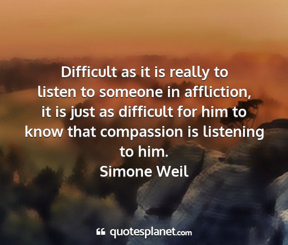 Difficult as it is really to listen to someone in affliction, it is just as difficult for him to know that compassion is listening to him.Simone Weil