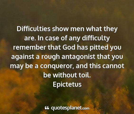 Difficulties show men what they are. In case of any difficulty remember that God has pitted you against a rough antagonist that you may be a conqueror, and this cannot be without toil.Epictetus