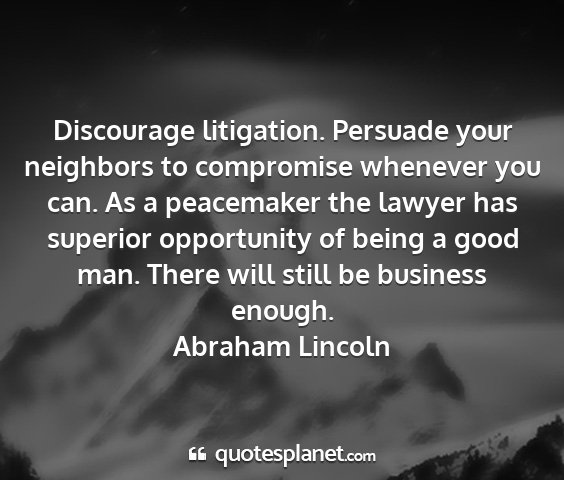 Discourage litigation. Persuade your neighbors to compromise whenever you can. As a peacemaker the lawyer has superior opportunity of being a good man. There will still be business enough.Abraham Lincoln
