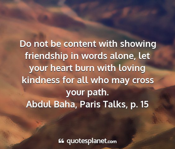 Do not be content with showing friendship in words alone, let your heart burn with loving kindness for all who may cross your path.Abdul Baha, Paris Talks, p. 15