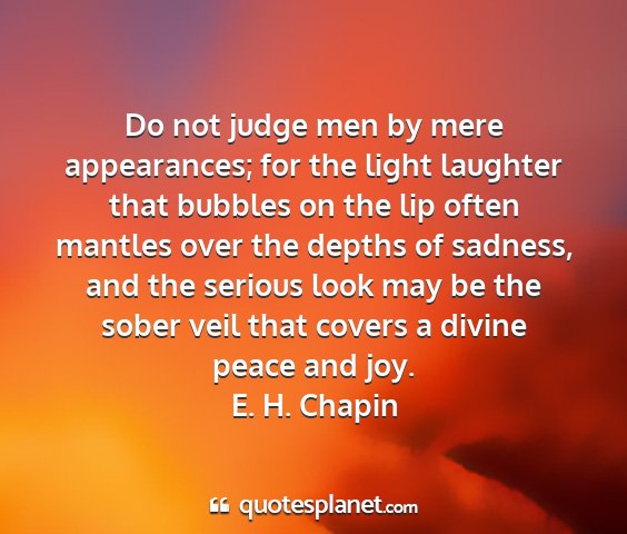 Do not judge men by mere appearances; for the light laughter that bubbles on the lip often mantles over the depths of sadness, and the serious look may be the sober veil that covers a divine peace and joy.E. H. Chapin