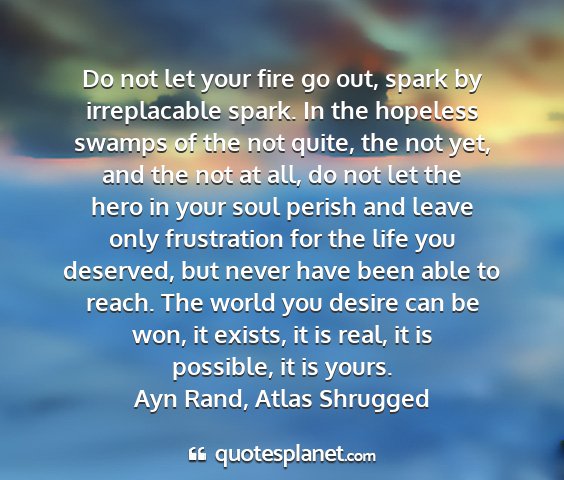 Do not let your fire go out, spark by irreplacable spark. In the hopeless swamps of the not quite, the not yet, and the not at all, do not let the hero in your soul perish and leave only frustration for the life you deserved, but never have been able to reach. The world you desire can be won, it exists, it is real, it is possible, it is yours.Ayn Rand, Atlas Shrugged