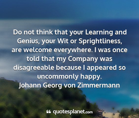 Do not think that your Learning and Genius, your Wit or Sprightliness, are welcome everywhere. I was once told that my Company was disagreeable because I appeared so uncommonly happy.Johann Georg von Zimmermann