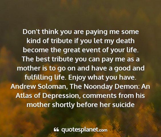 Don't think you are paying me some kind of tribute if you let my death become the great event of your life. The best tribute you can pay me as a mother is to go on and have a good and fulfilling life. Enjoy what you have.Andrew Soloman, The Noonday Demon: An Atlas of Depression, comments from his mother shortly before her suicide