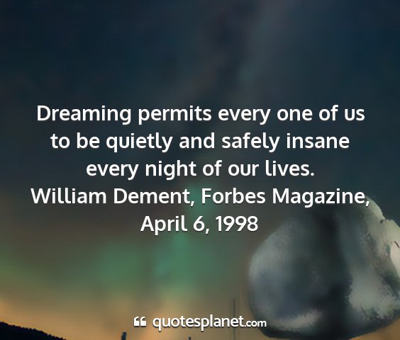 Dreaming permits every one of us to be quietly and safely insane every night of our lives.William Dement, Forbes Magazine, April 6, 1998