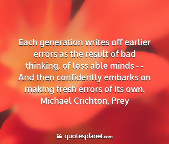 Each generation writes off earlier errors as the result of bad thinking, of less able minds - - And then confidently embarks on making fresh errors of its own.Michael Crichton, Prey