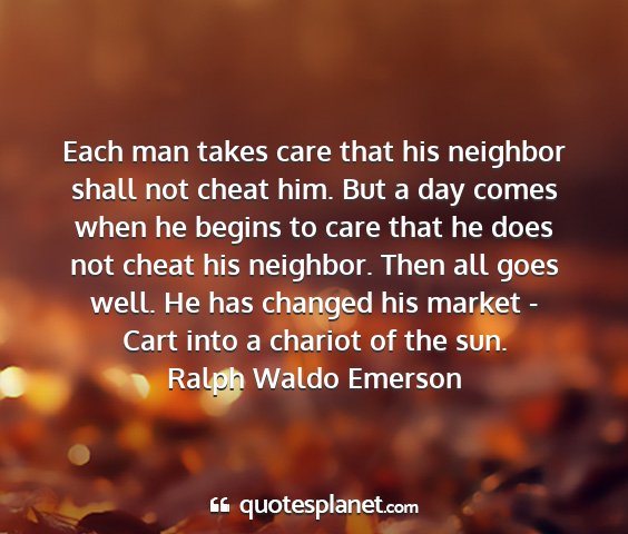 Each man takes care that his neighbor shall not cheat him. But a day comes when he begins to care that he does not cheat his neighbor. Then all goes well. He has changed his market - Cart into a chariot of the sun.Ralph Waldo Emerson