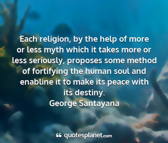 Each religion, by the help of more or less myth which it takes more or less seriously, proposes some method of fortifying the human soul and enabline it to make its peace with its destiny.George Santayana
