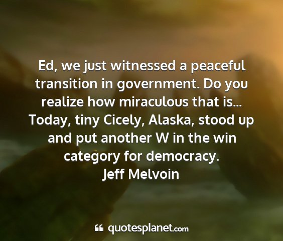 Ed, we just witnessed a peaceful transition in government. Do you realize how miraculous that is... Today, tiny Cicely, Alaska, stood up and put another W in the win category for democracy.Jeff Melvoin