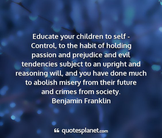 Educate your children to self - Control, to the habit of holding passion and prejudice and evil tendencies subject to an upright and reasoning will, and you have done much to abolish misery from their future and crimes from society.Benjamin Franklin