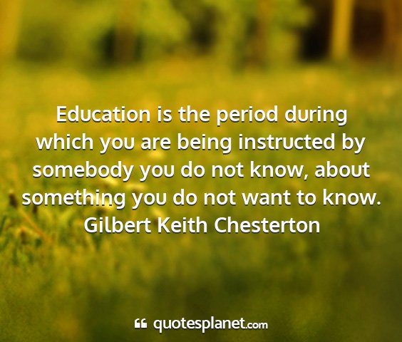 Education is the period during which you are being instructed by somebody you do not know, about something you do not want to know.Gilbert Keith Chesterton