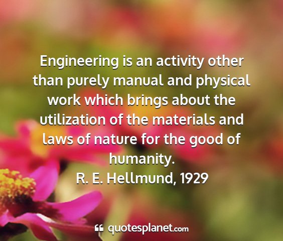 Engineering is an activity other than purely manual and physical work which brings about the utilization of the materials and laws of nature for the good of humanity.R. E. Hellmund, 1929