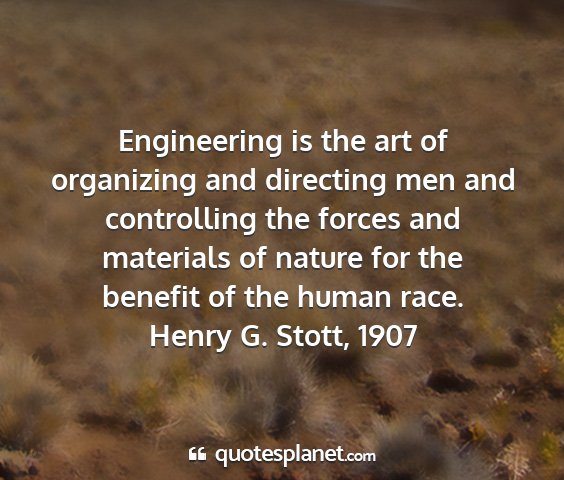 Engineering is the art of organizing and directing men and controlling the forces and materials of nature for the benefit of the human race.Henry G. Stott, 1907