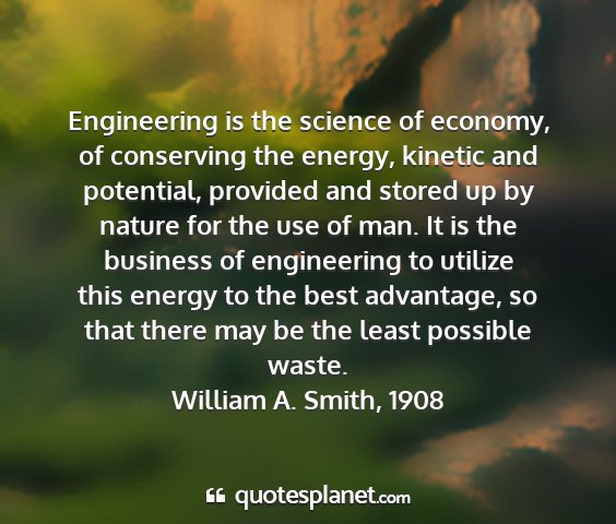 Engineering is the science of economy, of conserving the energy, kinetic and potential, provided and stored up by nature for the use of man. It is the business of engineering to utilize this energy to the best advantage, so that there may be the least possible waste.William A. Smith, 1908