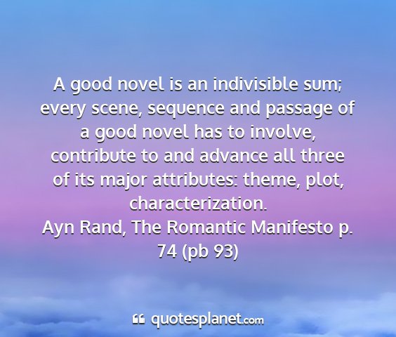 A good novel is an indivisible sum; every scene, sequence and passage of a good novel has to involve, contribute to and advance all three of its major attributes: theme, plot, characterization.Ayn Rand, The Romantic Manifesto p. 74 (pb 93)