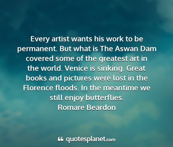 Every artist wants his work to be permanent. But what is The Aswan Dam covered some of the greatest art in the world. Venice is sinking. Great books and pictures were lost in the Florence floods. In the meantime we still enjoy butterflies.Romare Beardon