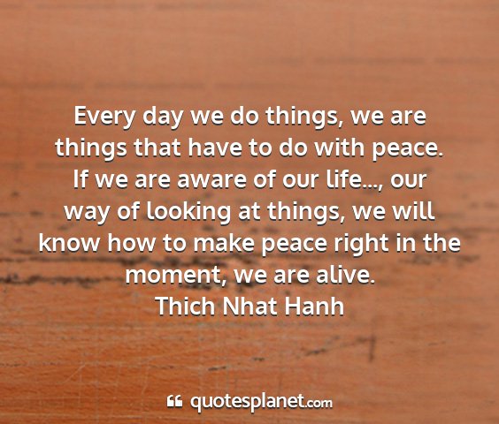 Every day we do things, we are things that have to do with peace. If we are aware of our life..., our way of looking at things, we will know how to make peace right in the moment, we are alive.Thich Nhat Hanh