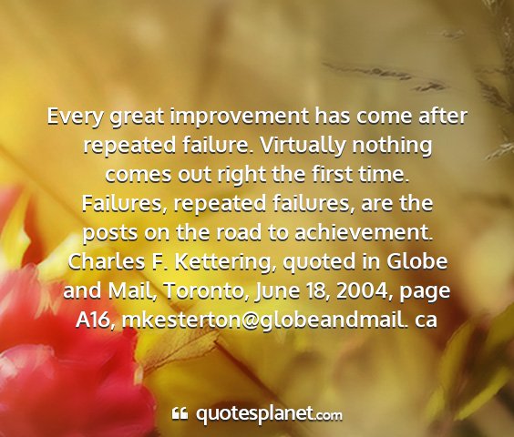 Every great improvement has come after repeated failure. Virtually nothing comes out right the first time. Failures, repeated failures, are the posts on the road to achievement.Charles F. Kettering, quoted in Globe and Mail, Toronto, June 18, 2004, page A16, mkesterton@globeandmail. ca