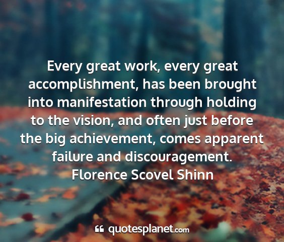 Every great work, every great accomplishment, has been brought into manifestation through holding to the vision, and often just before the big achievement, comes apparent failure and discouragement.Florence Scovel Shinn