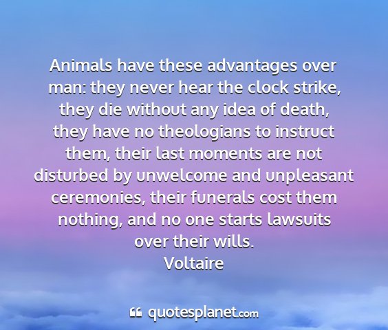 Animals have these advantages over man: they never hear the clock strike, they die without any idea of death, they have no theologians to instruct them, their last moments are not disturbed by unwelcome and unpleasant ceremonies, their funerals cost them nothing, and no one starts lawsuits over their wills.