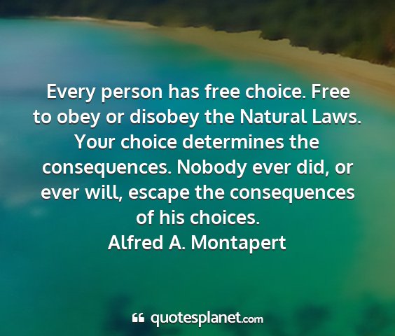 Every person has free choice. Free to obey or disobey the Natural Laws. Your choice determines the consequences. Nobody ever did, or ever will, escape the consequences of his choices.Alfred A. Montapert