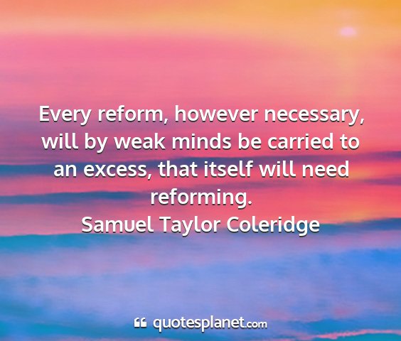 Every reform, however necessary, will by weak minds be carried to an excess, that itself will need reforming.Samuel Taylor Coleridge