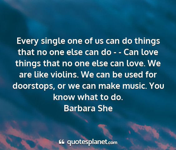 Every single one of us can do things that no one else can do - - Can love things that no one else can love. We are like violins. We can be used for doorstops, or we can make music. You know what to do.Barbara She