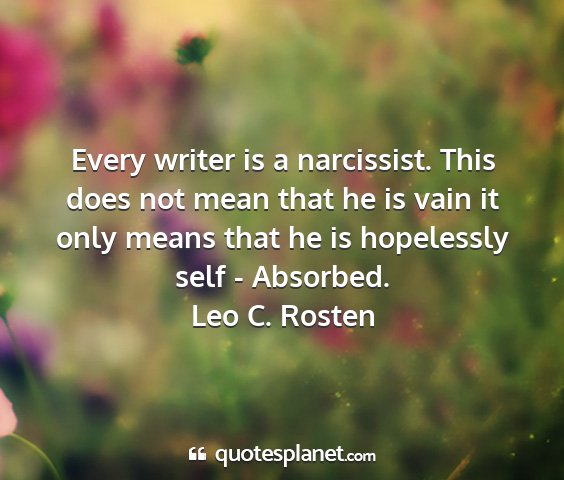 Every writer is a narcissist. This does not mean that he is vain it only means that he is hopelessly self - Absorbed.Leo C. Rosten