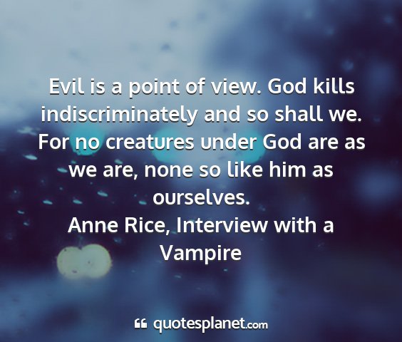 Evil is a point of view. God kills indiscriminately and so shall we. For no creatures under God are as we are, none so like him as ourselves.Anne Rice, Interview with a Vampire